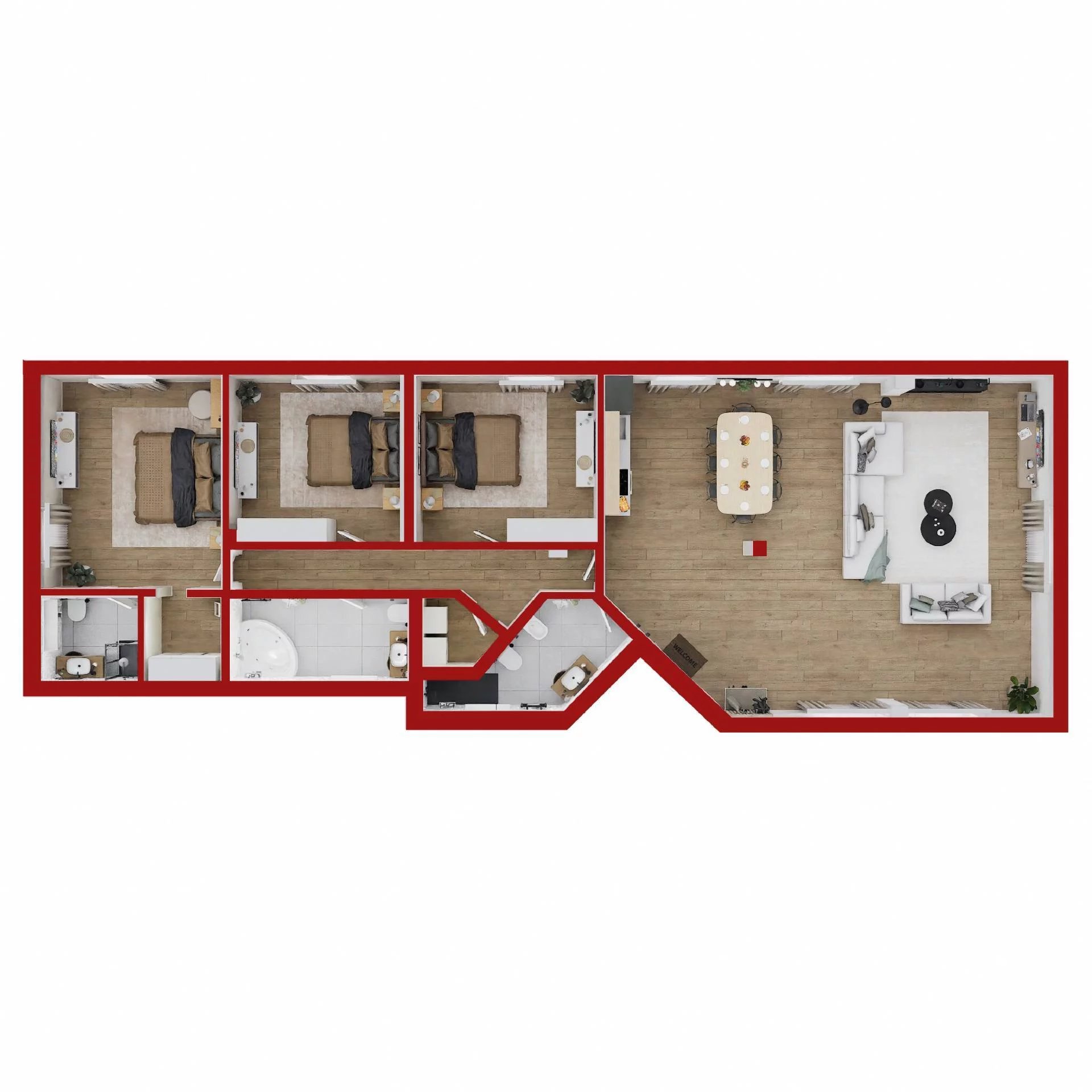 It is developed all on one floor, with a total area of 150 square meters. The spaces are divided into 5 rooms, including 3 bedrooms and 2 bathrooms.