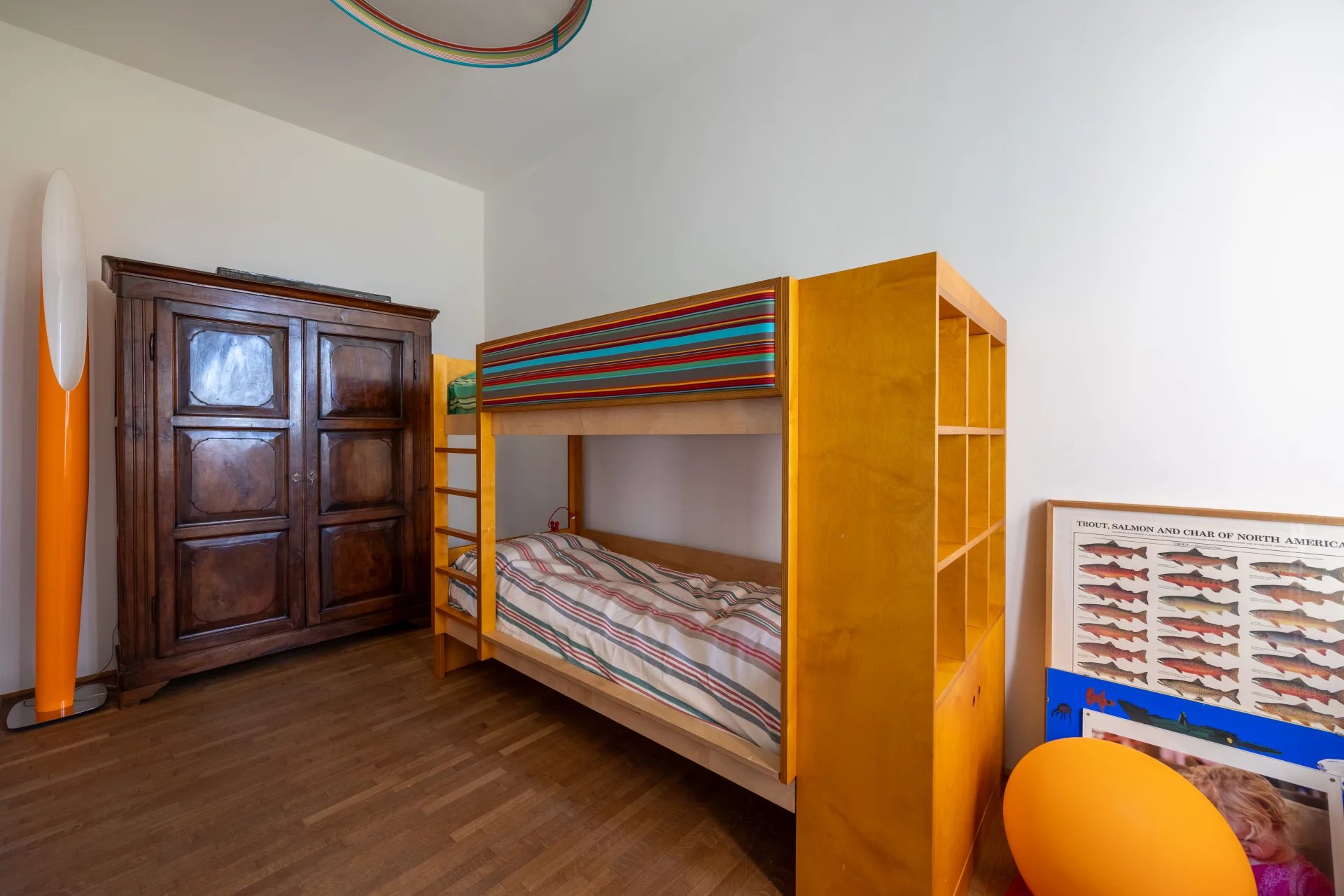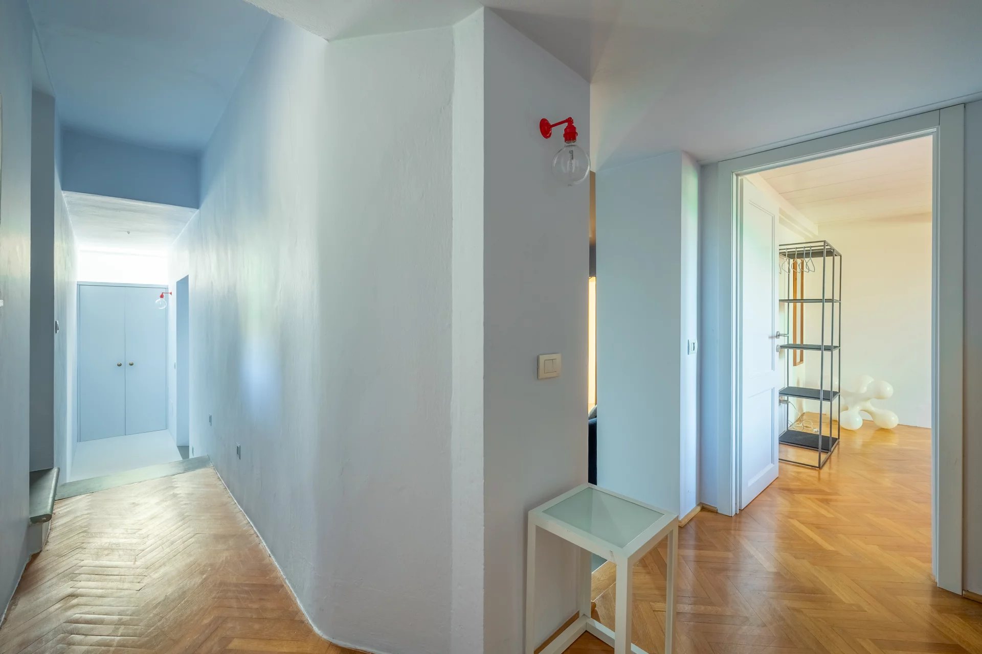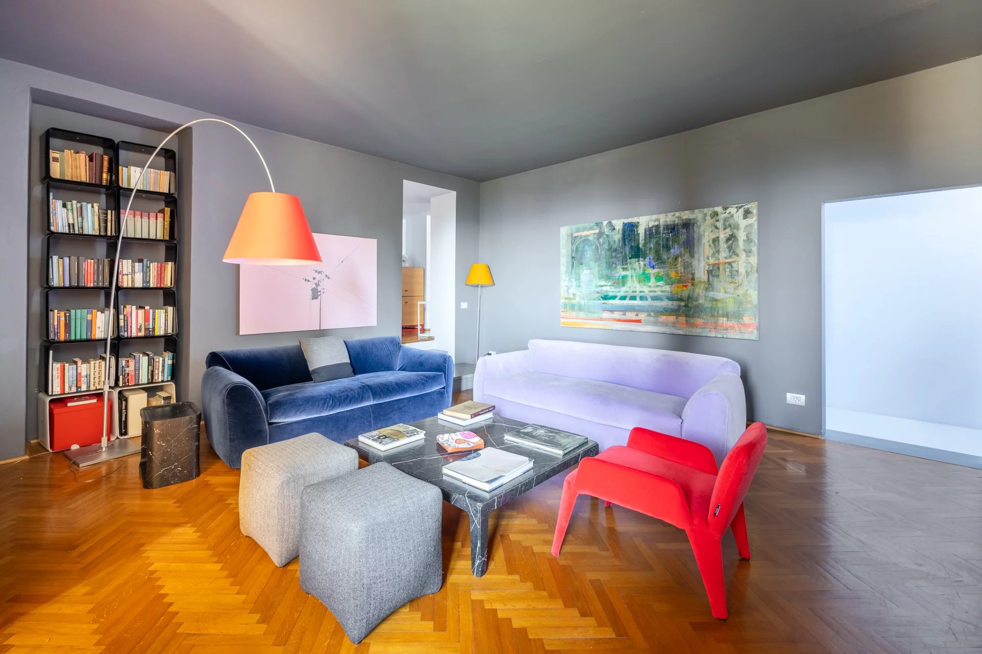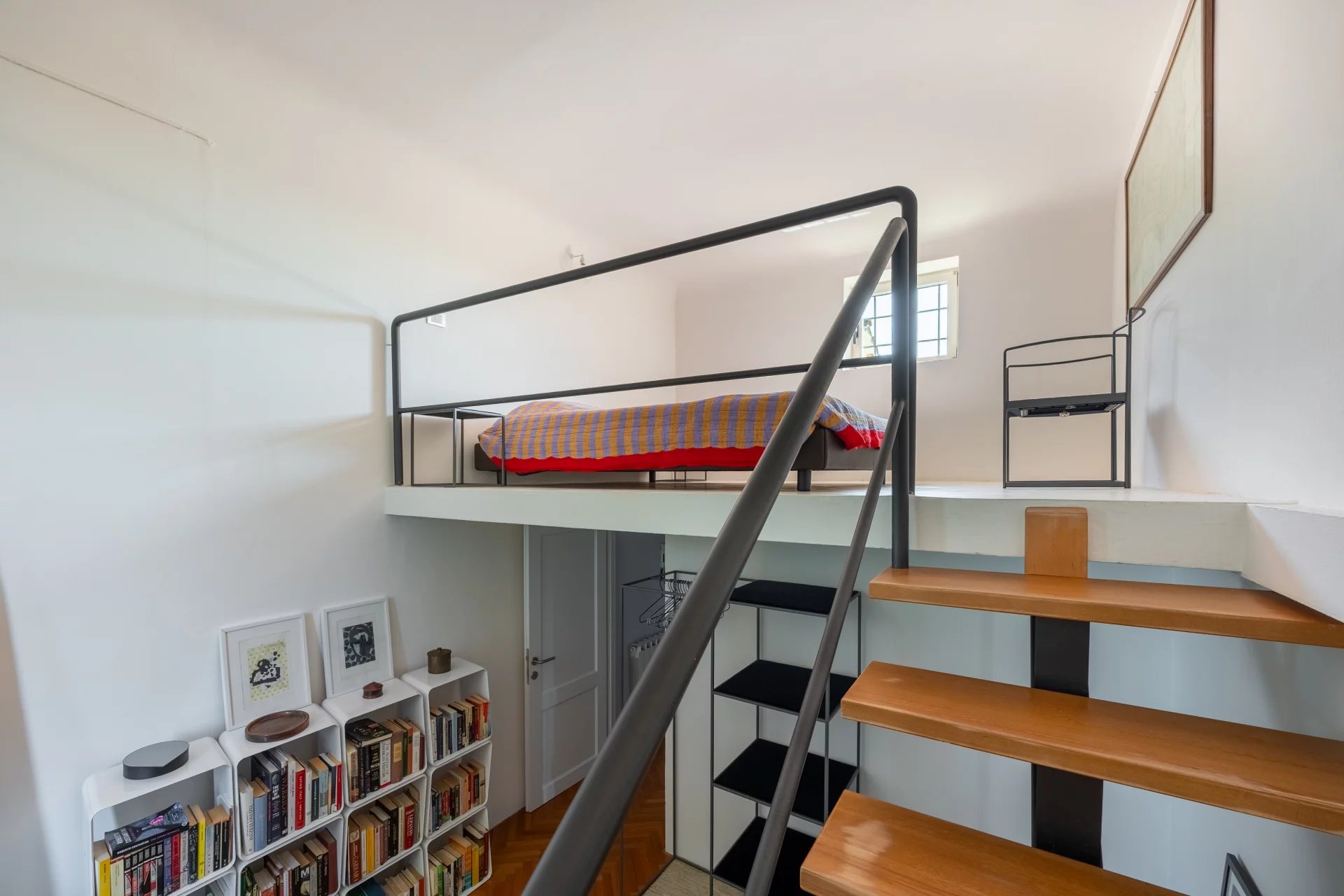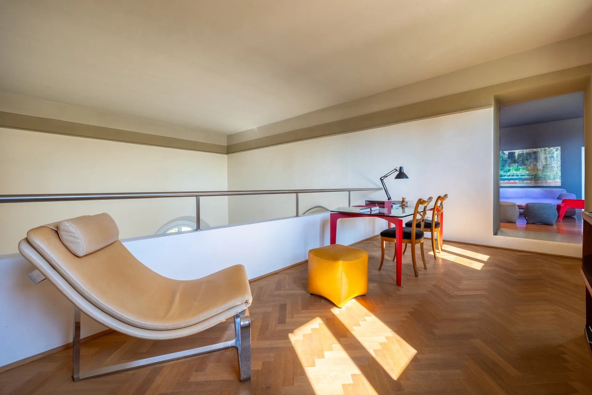 The entrance opens onto a magnificent, light-filled double-height living room, which hosts a scenographic lounge area and dining room. Adjoining this space, the kitchen has direct access to the garden, shared with another property yet easily accessible. On the same level there are two bedrooms, two bathrooms, a hallway/study, and a practical storage room.
